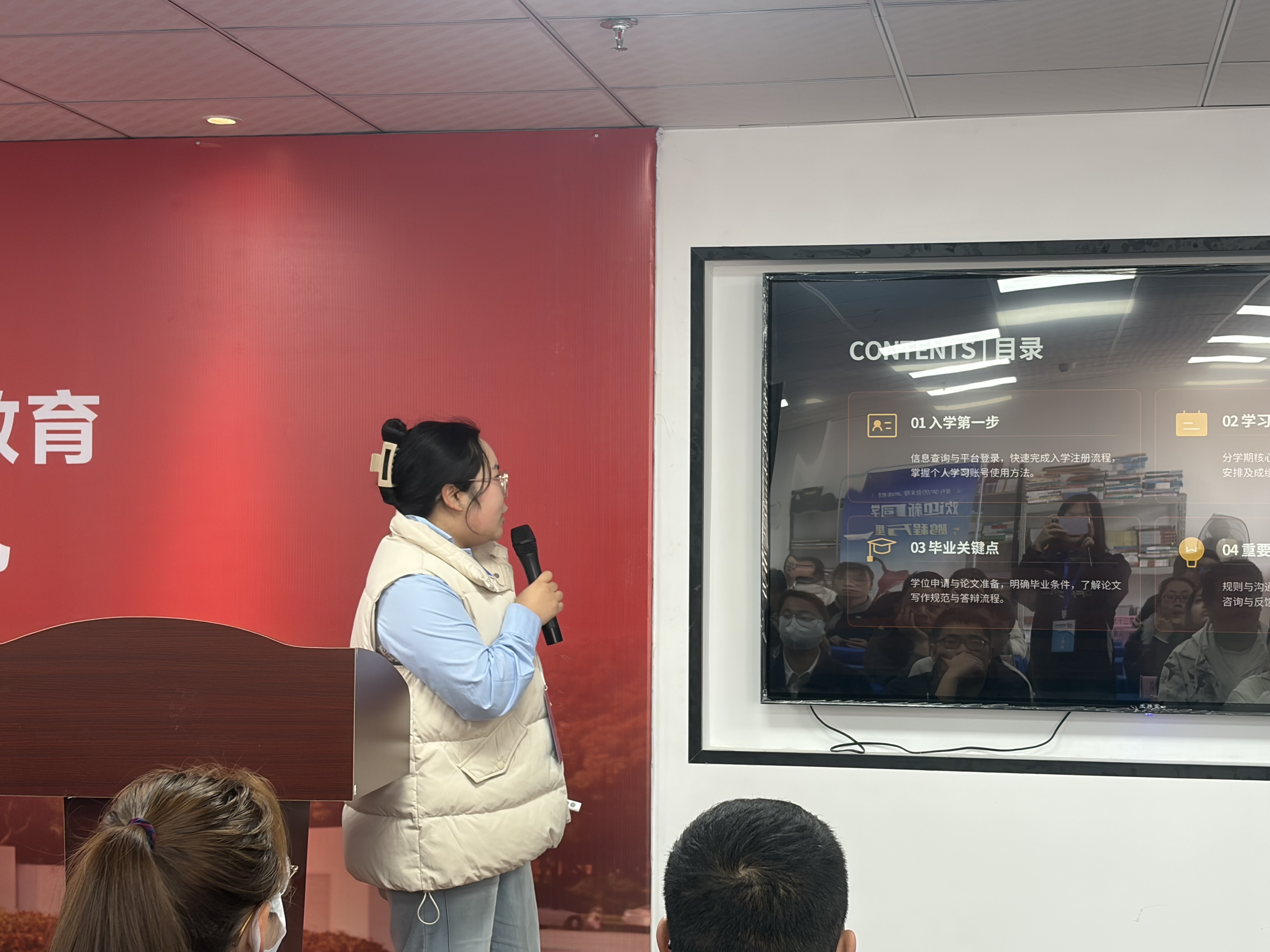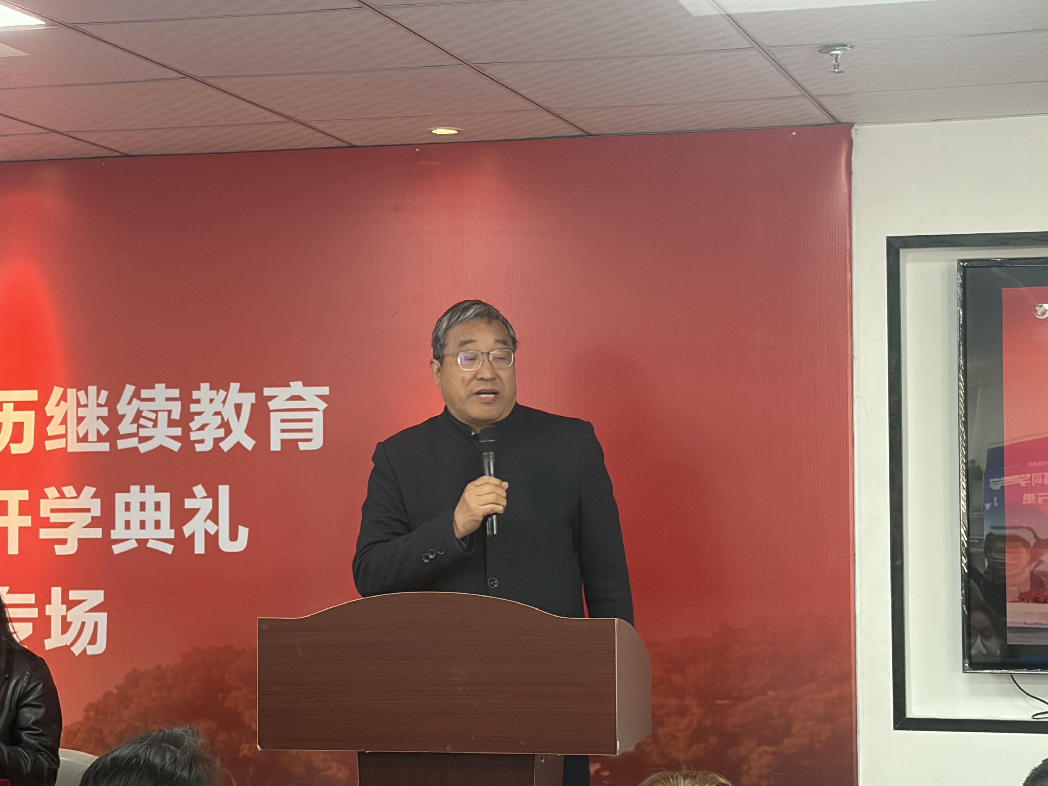 宁波大学育成教学点辅导教师俞建萍老师上台发言。俞老师娴静温婉、平易近人,深受广大师生喜爱与认可。她将以耐心细致的陪伴、专业悉心的指引,助力各位新同学快速融入浓厚的学习氛围。相信在俞老师与全体教师的陪伴下,新生定能逐梦前行、学有所成!