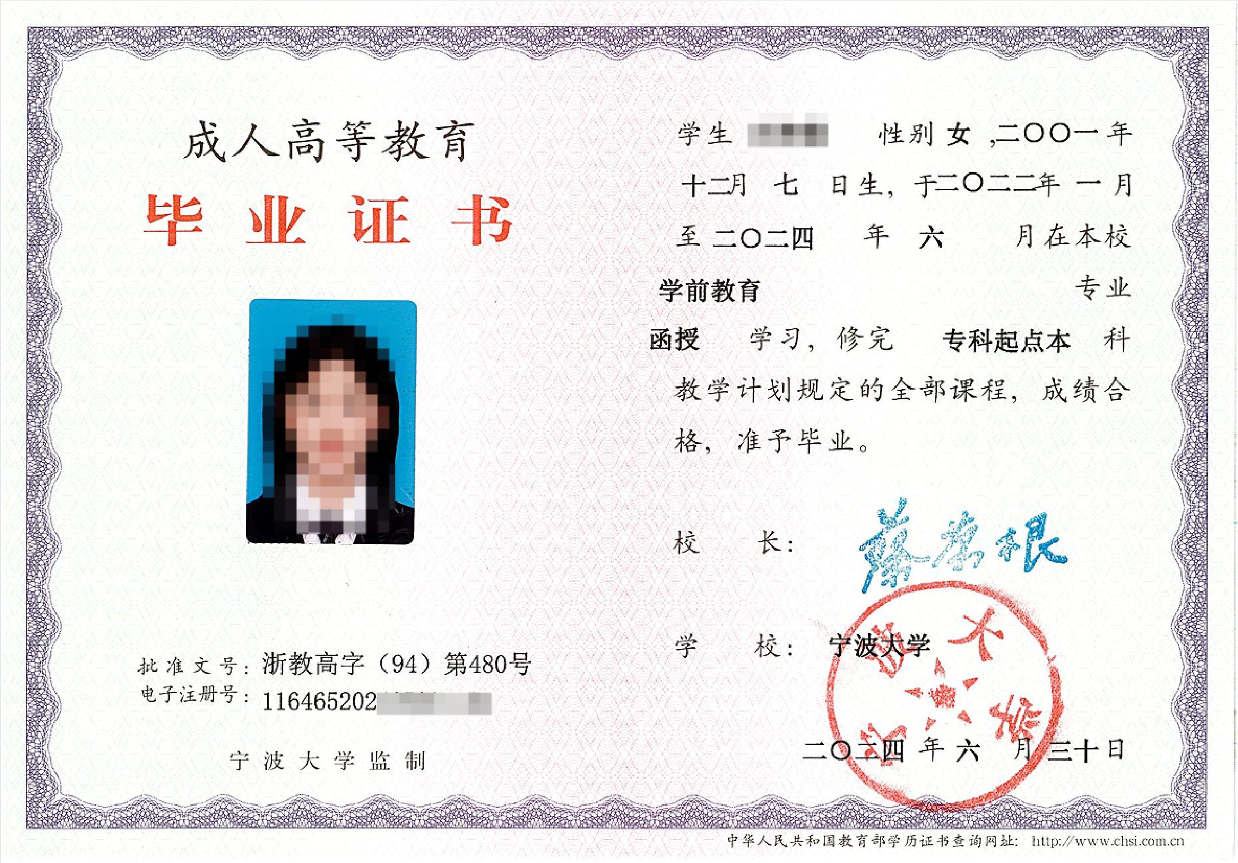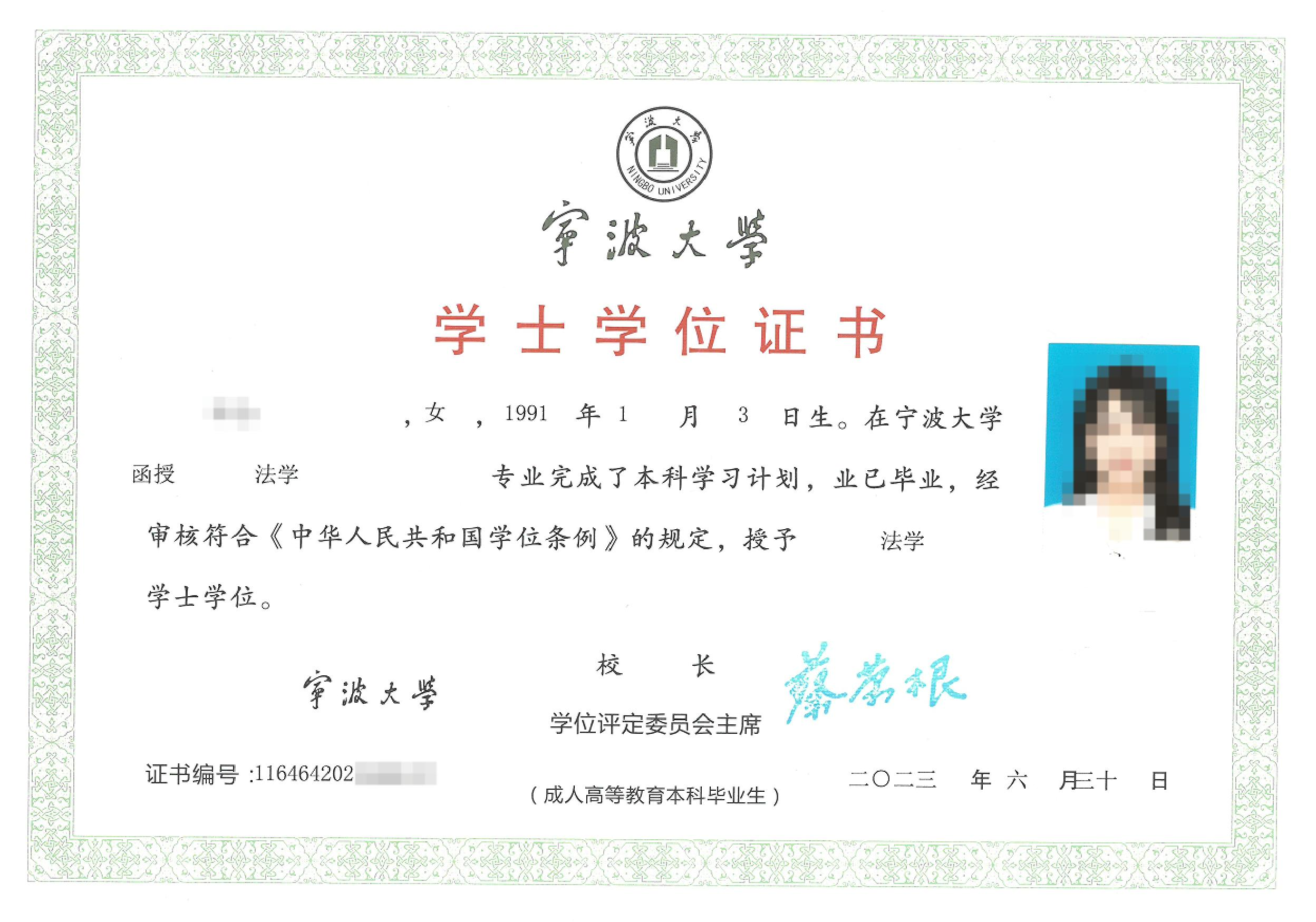 学生修完本专业教学计划规定学分,成绩合格且符合毕业条件的,由宁波大学颁发经教育部电子注册的高等学历继续教育毕业证书;符合学士学位授予条件的本科毕业生,学校将授予相应学士学位。学历及学位证书样本详见下图。